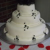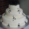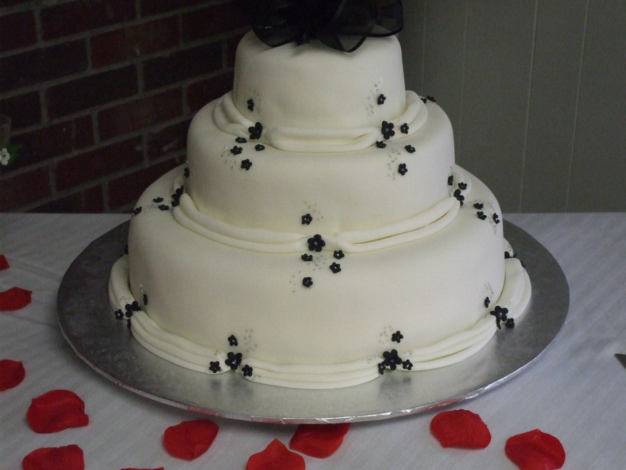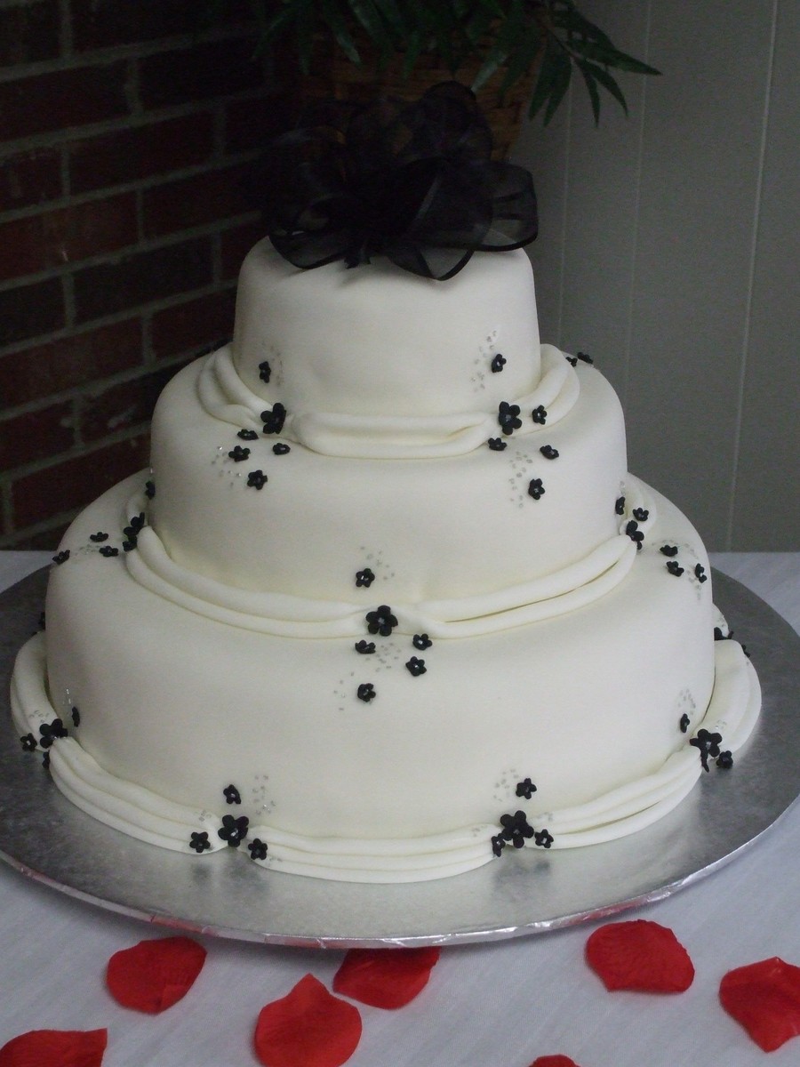 This wedding cake is covered in bc and then fondant. It has tiny black flowers and silver sparkling sugar accents. The topper is a bow made of black silk ribbon.
