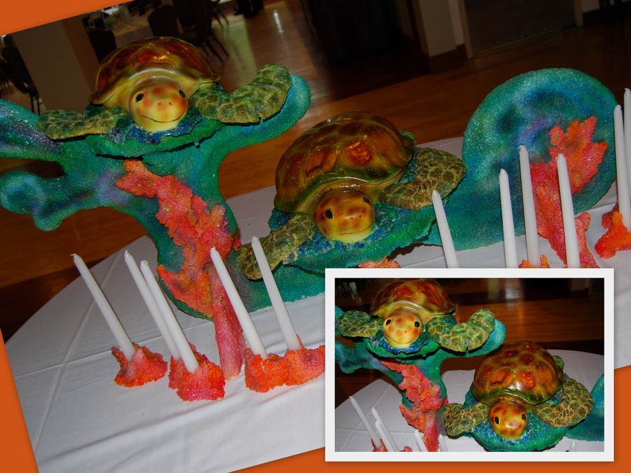 Stand was created out of MDF (wood) and covered in RKT and airbrushed. Turtles were carved and airbrushed, flippers were RKT as well.