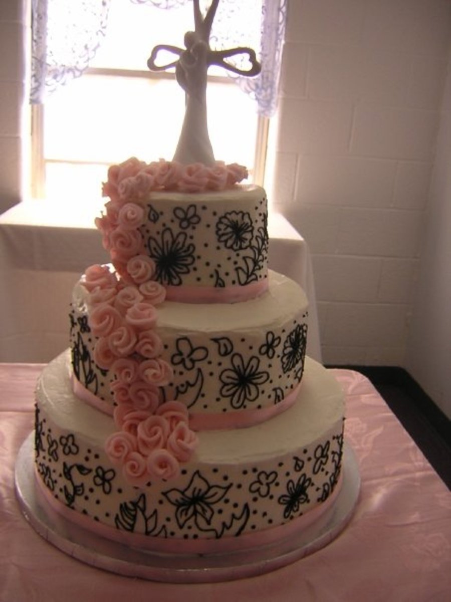 3 tiered buttercream cake, top and bottom tiers are WASC, middle tier is Pink Champagne, Free handed design, Duff Roses