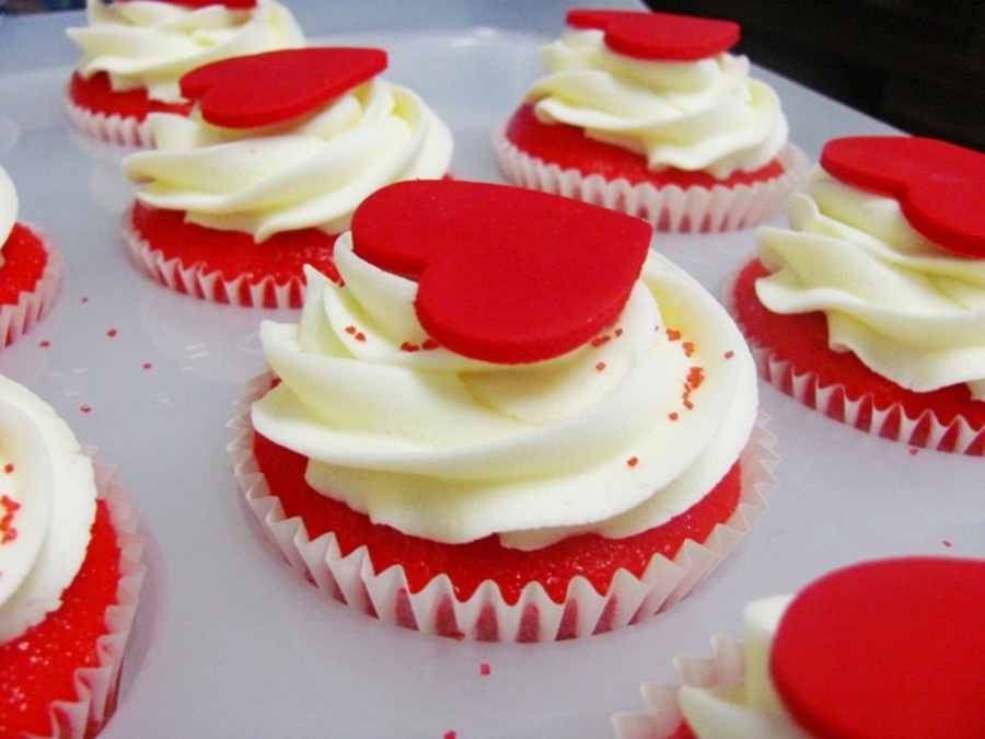 Strawberry butter cake (tinted red) topped with vanilla buttercream icing, red sugar crystals and a red fondant heart.