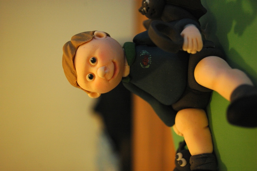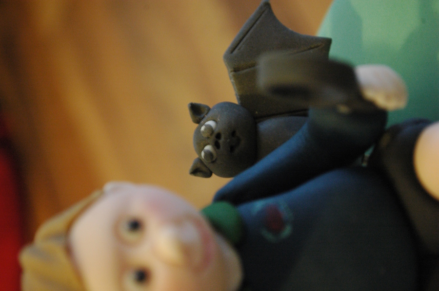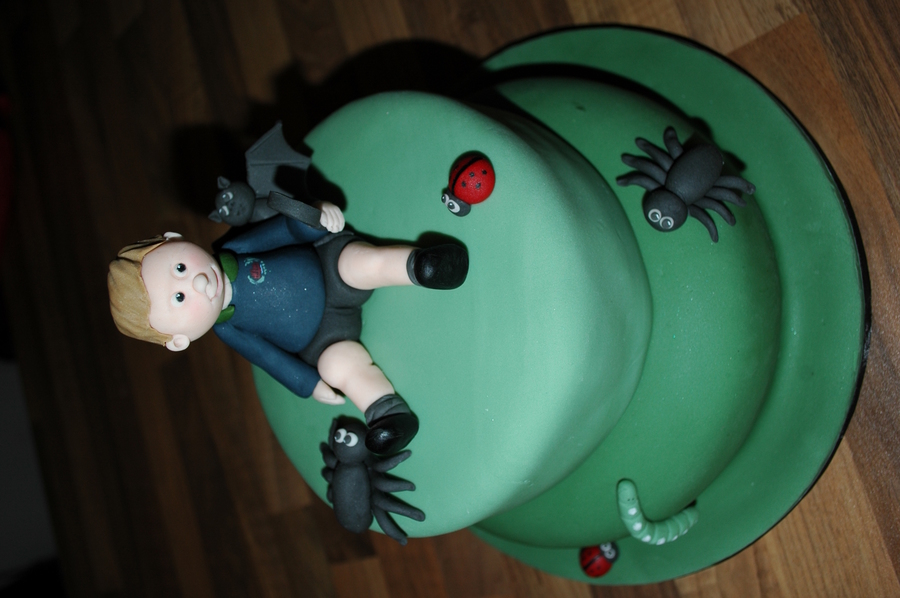 Schoolboy hunting for bugs with magnifying glass...My brief was bats & spiders and I was given 1 day's notice hence a rather plain cake! All edible, decorations made with modelling fondant.