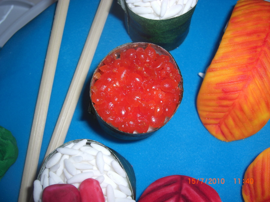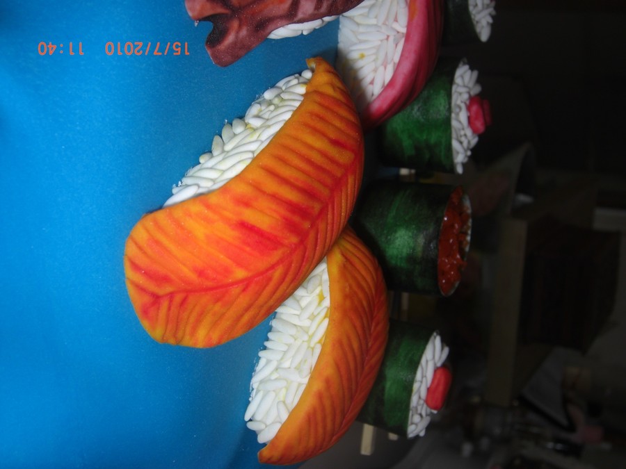 Many thanks to CorinasConfections for her inspiration - I can only dream that mine would be as good as hers! Everything (apart from the chop sticks) is edible, rice grains are all handmade from sugarpaste. It's Nigella's chocolate soured cream cake - yum! TFL! x