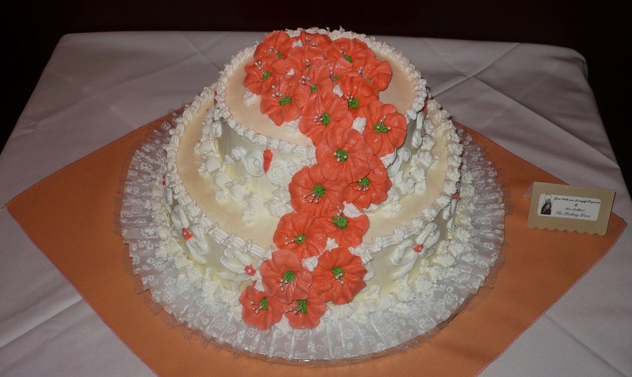 This is a two-tier white velvet wedding cake with lemon filling, smooth buttercream icing and handmade, shimmer-dusted, royal icing petunias with pearl-tipped stamens I used a Wilton press set for the royal icing scrollwork, with pearl candy accents.