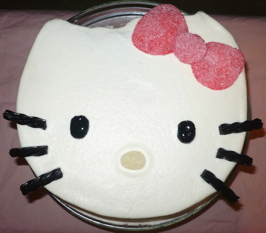 Hello Kitty birthday cake. It's a vanilla cake with smoothed buttercream icing. For the bow I rolled gumdrops flat in sugar and cut out the three bow sections. The nose and eyes are also gumdrops; the latter purple gumdrops painted with black food coloring. The whiskers are black licorice.