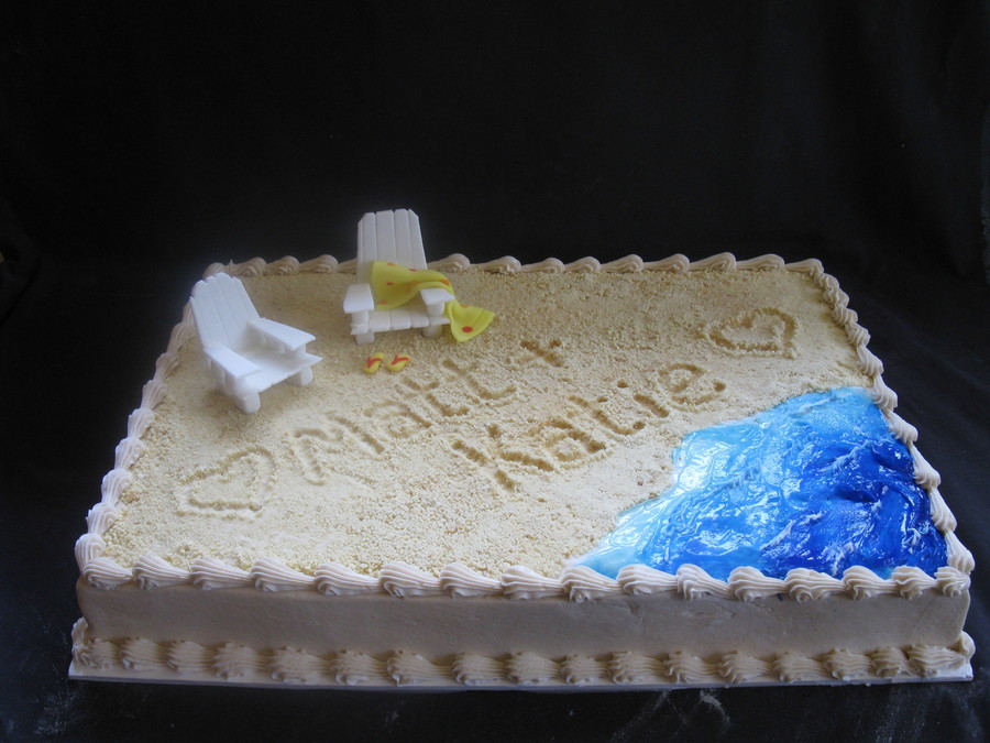 The customer requested a sheet cake that she could travel 5+ hours with. It is for a beach wedding and she just wanted something beachy. The chairs are fondant glued together with chocolate. the water is piping gel and the beach is crushed animal crackers.