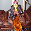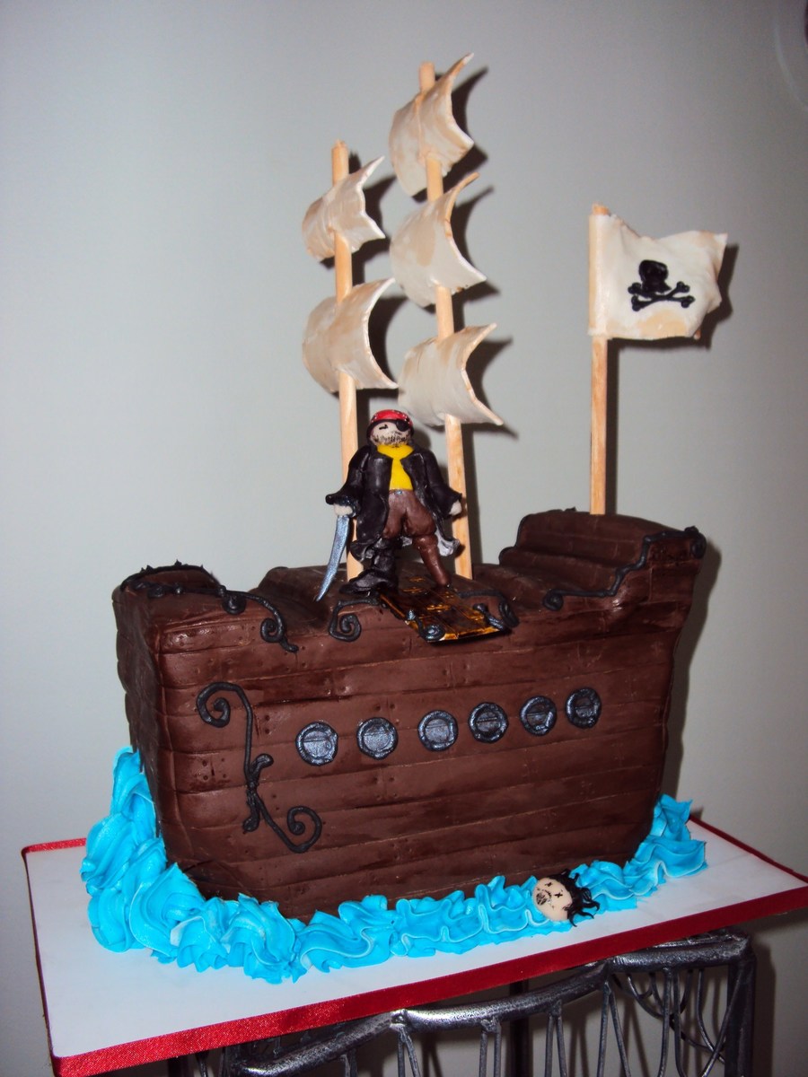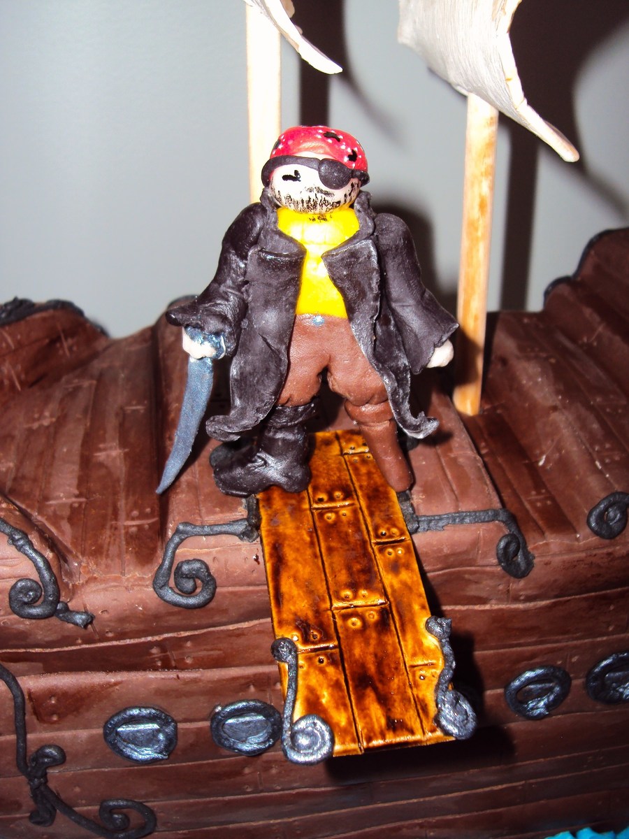2 10" squares cut and stacked then carved, covered in modeling cocolate, sails in gumpaste, pirate is modeling chocolate too! Had sooo much fun with this one! Cake is white butter cake with creme de menthe chocolate chunk buttercream filling.