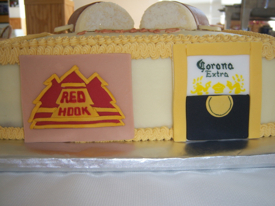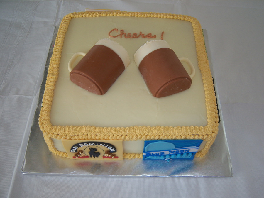 4-layer beer cheese cake with bacon cheddar cream cheese filling and cream cheese frosting. Beer mugs on top are solid chocolate and the labels around the sides are made of fondant. This was for my friends' rehearsal dinner.