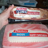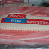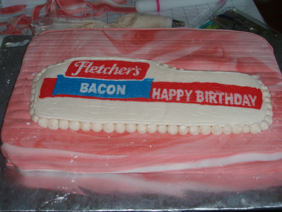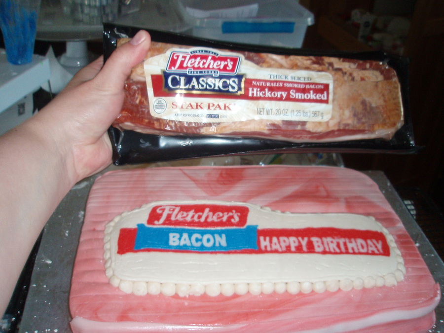 I have a friend who loves bacon. I had to try making him a bacon cake for his birthday. His last name is Fletcher, and we have a brand of bacon here called "Fletcher's", so I tried to make it look like a package of Fletcher's bacon. It's just a 9x13 devil's food covered in fondant with a frozen buttercream transfer for the package label. It kind of looks gross... but he loved it, and it tasted good!