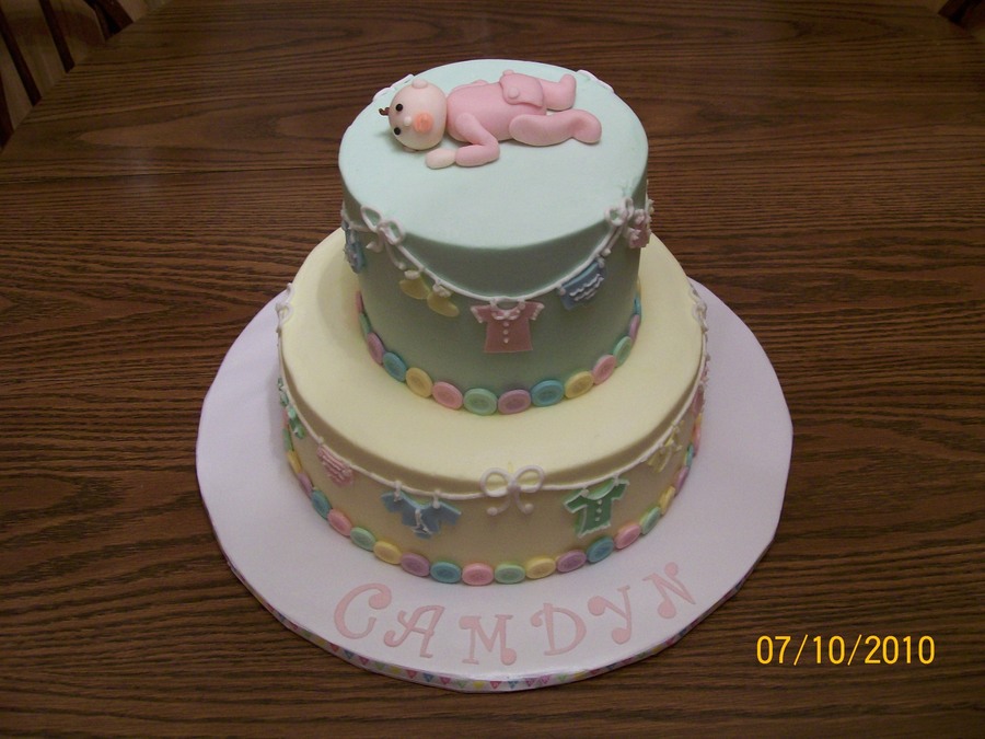 Top is chocolate with creme de menthe BC, bottom is WASC with chocolate ganache and strawberry. All iced in BC. Fondant baby and clothes, chocolate buttons. Thanks to EVERYONE who posted baby shower pics, especially MrsButtercream, Creative_Cakes_By_Angela and to lesliem1187 for the cutest baby. Thanks everyone!!