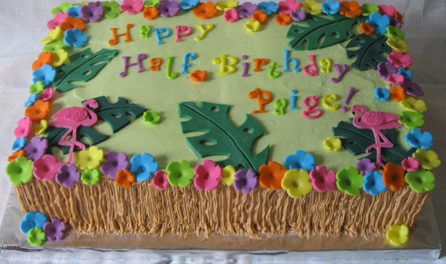 Iced in buttercream; fondant flowers and letters; fondant flamingoes (sp?) and leaves are hand-cut...tfl!