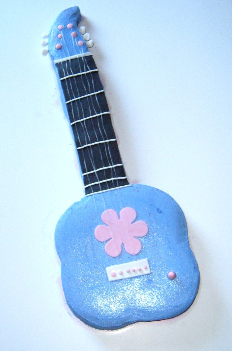 chocolate cake and buttercream, fonant accents, used dental floss for strings(got the idea from here) my first guitar I hope to do better next time