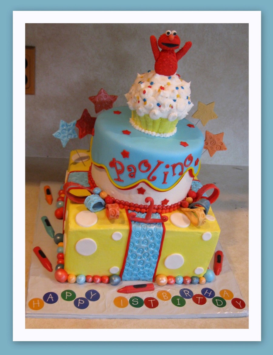 Variation of Elmo cake I did a while ago (which was a variation of one found on the net!) 7" round on 10" square. BC. Blue on top tier is fondant. Accents are mostly fondant, some GP. Crayons are candy melts. Elmo is GP; after I took the picture I put more BC around Elmo's lower body to make it look like he was coming out of icing. Everything dusted with super pearl luster dust. Name in Funky tappits.