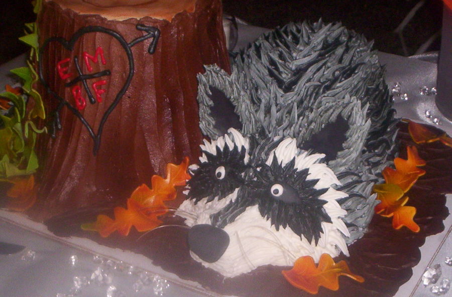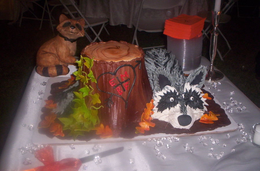 The couple loves to hunt and they enjoy coon hunting with their dogs. the bride said do whatever and this is what i came up with. The raccoon is red velvet with cherry filling (ooozy) and the tree truck is chocolate fudge. It is a collection of fondant and buttercream.