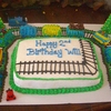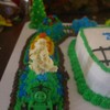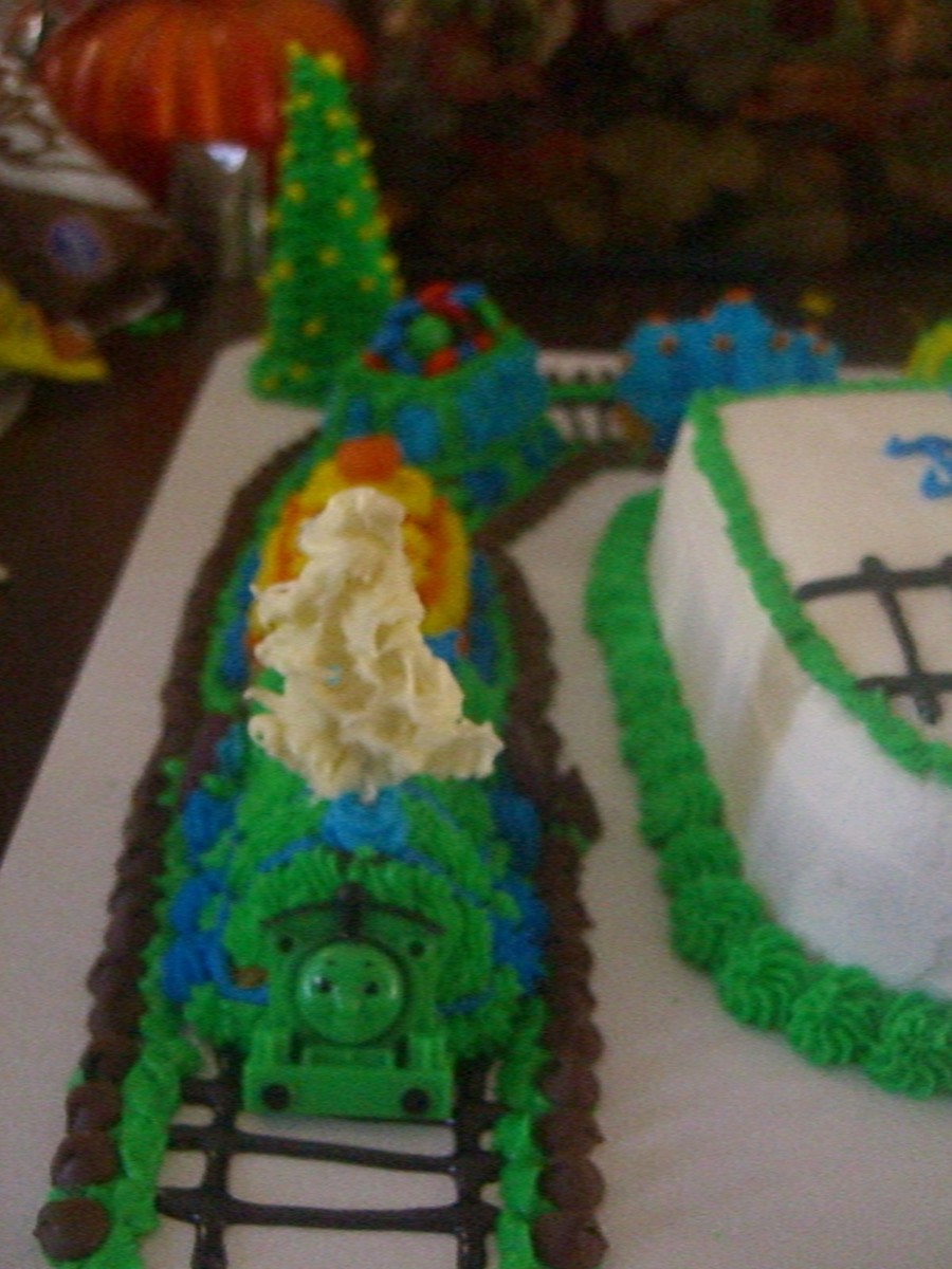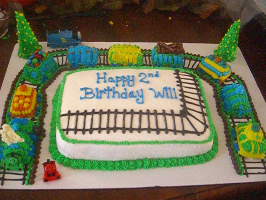 huge cake!! train tracks for train!! the train wrapped around the cake. it was too big and long to put ontop of the cake, so i thought around was pretty. the train has alot of candy on tops!!!