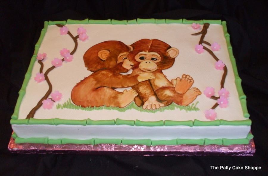 This sheet cake was made to match the invitations. The monkey couple was done in run sugar and hand painted with food coloring.