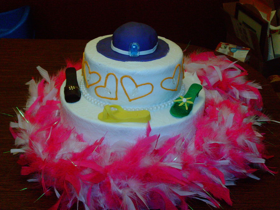 Mom wanted a cake to go with her little girls dress up party. The shoes are gum paste and the crystals are sugar...but the boa is real!! lol