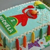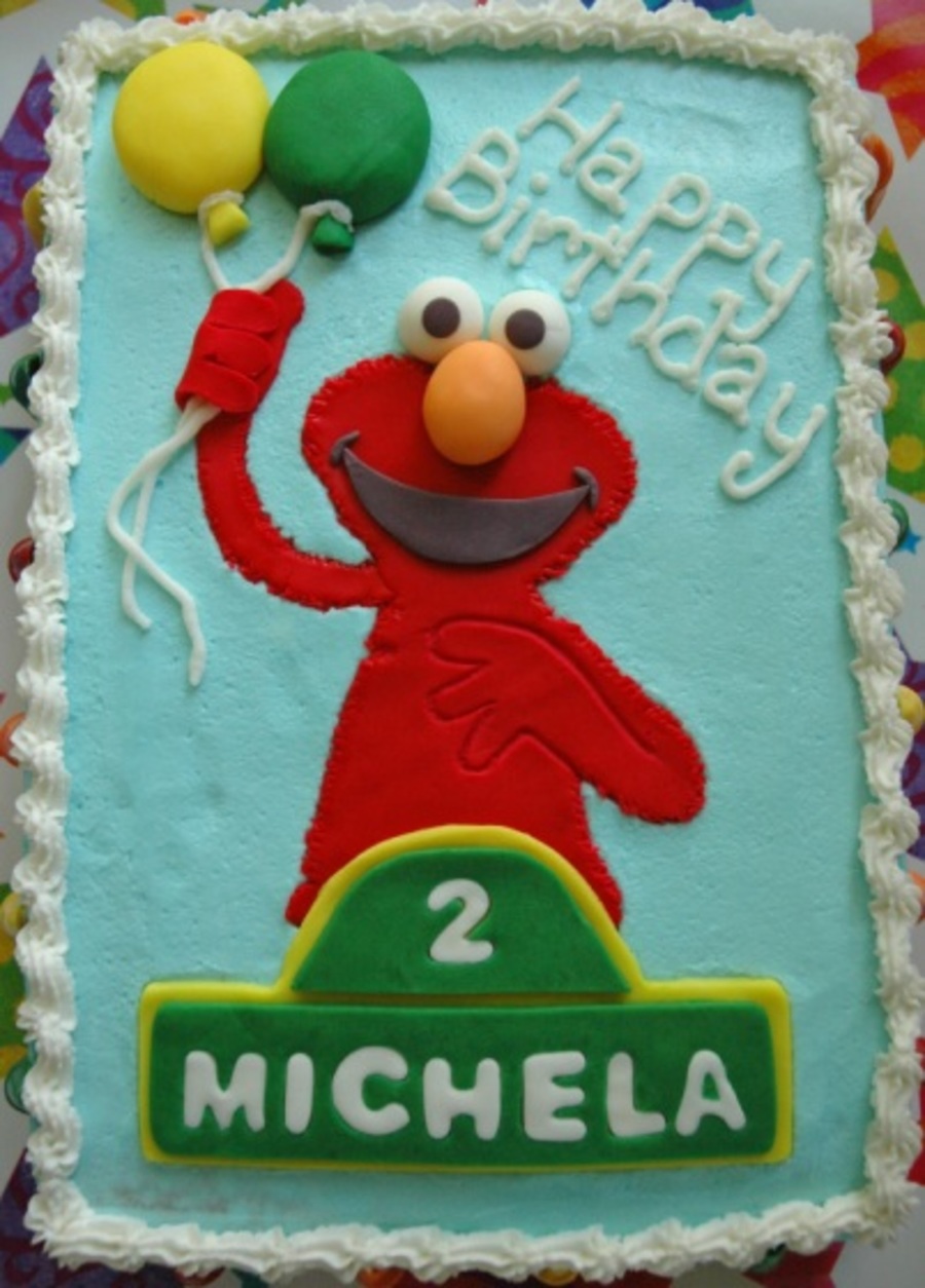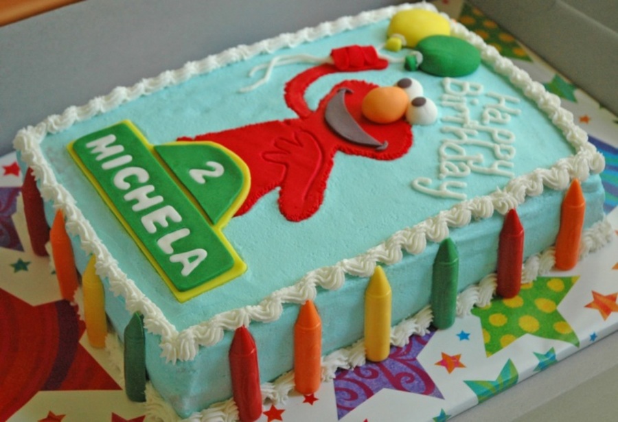 Requested for a little girl's second birthday party. Two 1/4 vanilla sheet cakes with whipped chocolate filling. Iced in buttercream and decorated with custom fondant accents. I also made white chocolate crayons for the side border. La la la la... Elmo's World...
