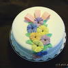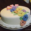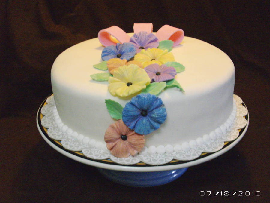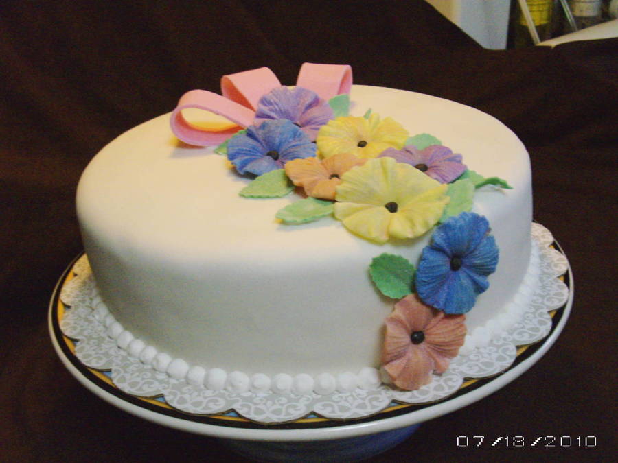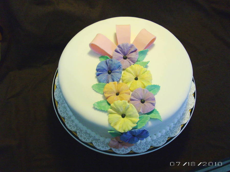 These flowers were made from a mold I got at the Florida ICES Day of Sharing in Feb 2010. The cake is a 10" round covered in buttercream and MFF, the border is royal icing and the flowers and bow are gumpaste. For a first attempt - I was very happy.