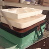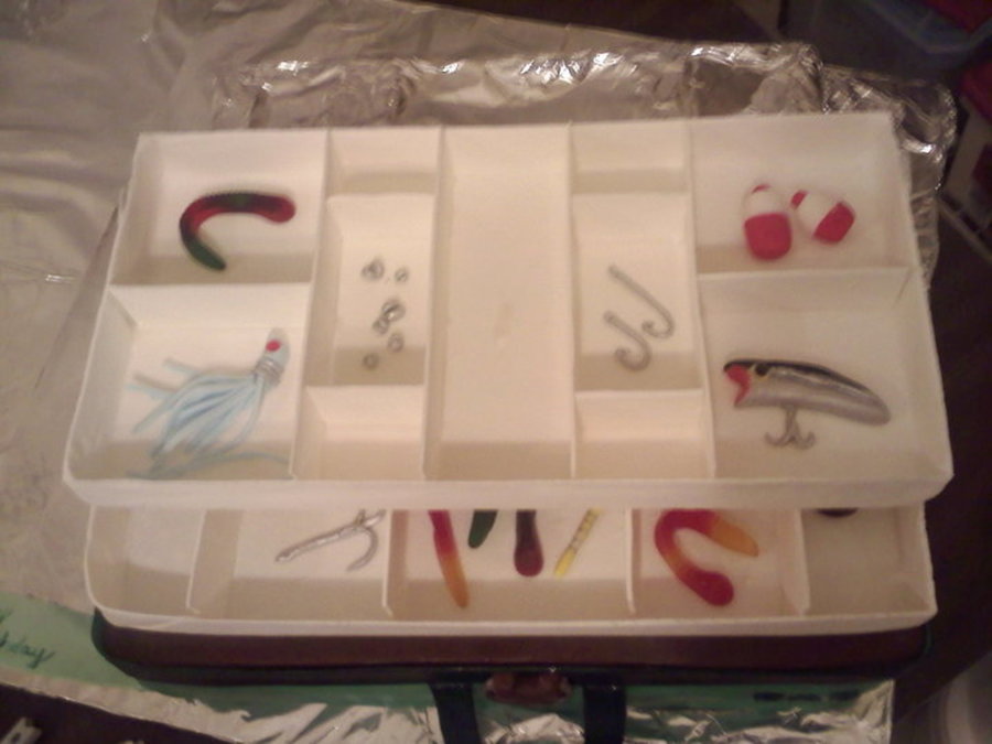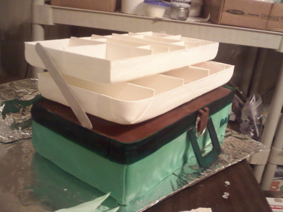 Thank you CC for inspiration. used largest pan cut in half stacked and filled done this twice. used 2 layers filled for lid which isnt attached at this point. trays are gumpaset/fondant mix I used a scrabble box as a mold till it dried.(dust extra heavy in corners) all tackle is fondant and painted. TY for looking