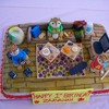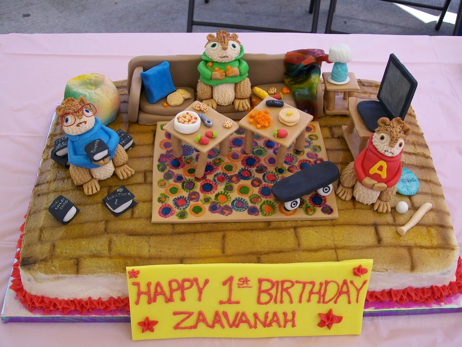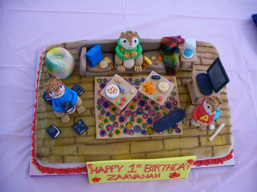 I made this cake out of white cake, strawberry filling, and a french vanilla buttercream frosting. Everything is made out of marshmallow fondant and all edible except Simons glasses which were wire. I used chocolate and caramel marshmallows. This one was so much fun to make with all the little details like the remote for the tv and the orange luster dust for the cheese puff powder. I didnt like how the chipmunks turned out but it was my first time trying an animal figure. I know now how I would do things differently next time.