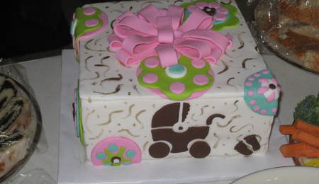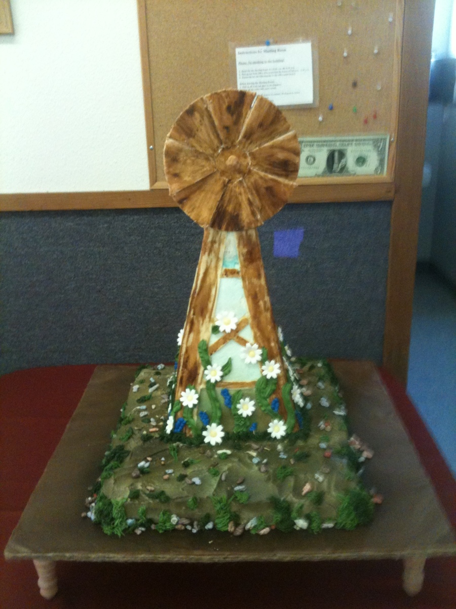 My first "extreme" cake. Yes, the windmill turned via a tiny hobby motor. Used a volume control switch to adjust the speed of the motor and it ran on one AA battery. Cake was Dk. Choc., Fr. Van., Strawberry & Strawberry Banana. So a cake version of the banana split. Iced with BC, air brushed and piped decor, Windmill made from modeling chocolate painted to look like cedar. Gumpaste daisies and bc bluebonnets, grass & leaves. Chocolate rocks. The windmill was a plan b windmill as the original gumpaste windmill broke while attaching it to the motor and was unrepairable due to time constraints, so I painted an 8 inch cake board with royal icing then after it dried painted it with gel food color to make it look like wood. The client loved it! It was a 360 design