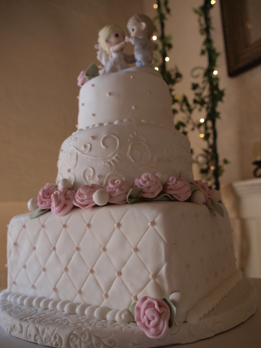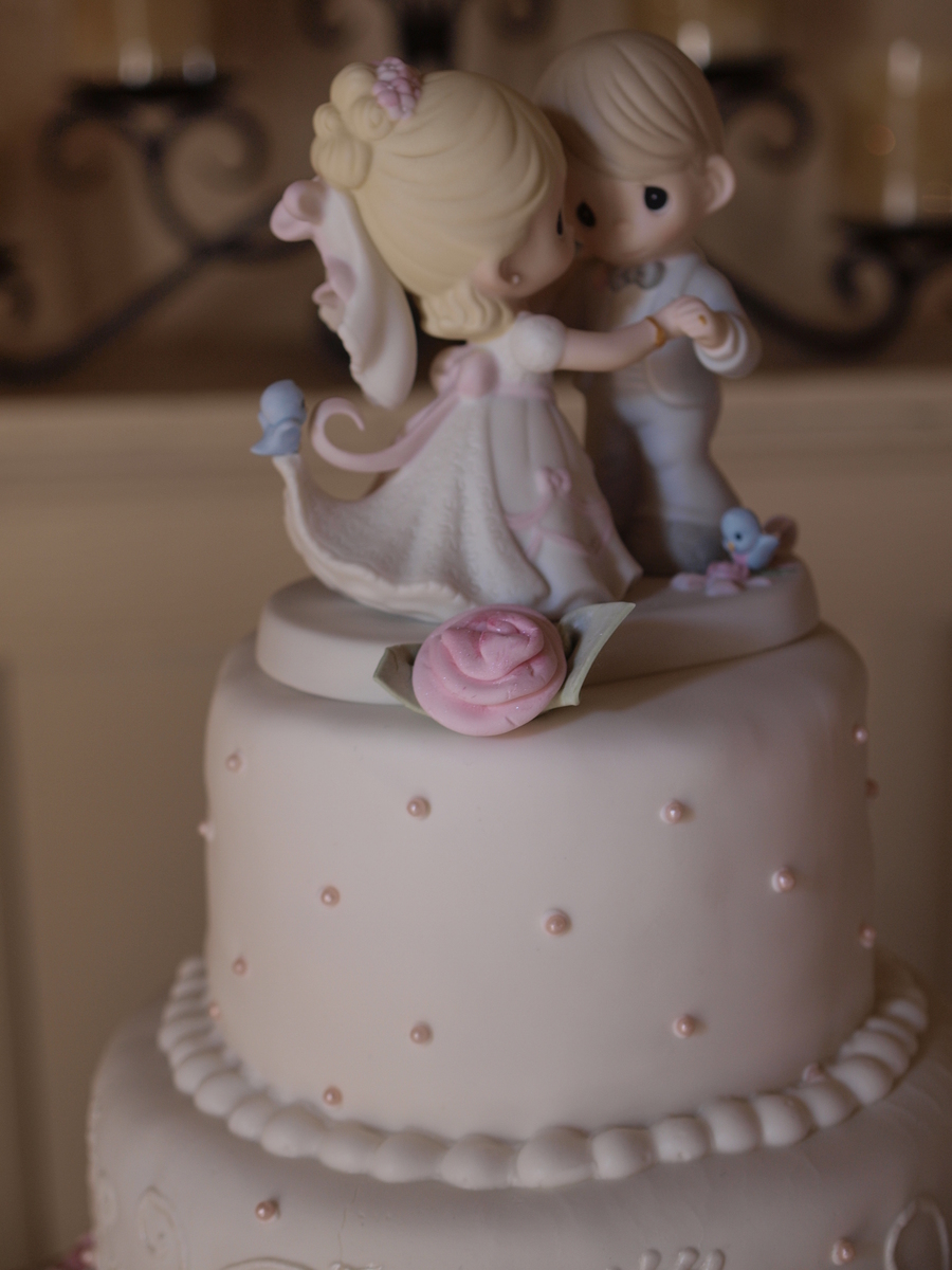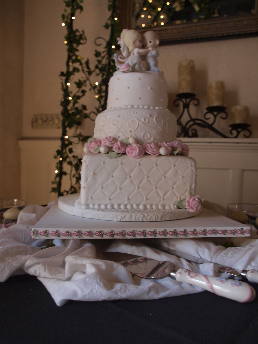 The bride provided my a picture of her "Precious Moments" wedding cake topper, and I was immediately inspired to incorporate elements like ribbon roses, and the scrollwork design on the Precious Moments bridal gown. The colors of the wedding were pink and sage green, so I added soft pink pearls to each tier. The bottom tier is a 10" square, followed by an 8" and 6" round. But my favorite part, was the cake itself.... basic white cake with just a hint of orange, filled with alternating chocolate mousse and orange curd mousse!
