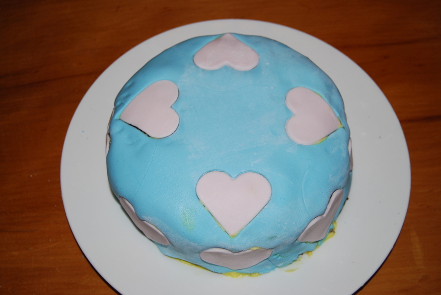 So this is my first fondant cake. No training (yet!) I made my own MMF and roled over the cake - it is really bumpy and foldy. Then I cut out hearts and inlaid pick ones. Would probably just stick hearts on next time, as there were gaps.