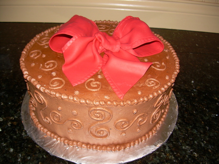 Simple red bow on a chocolate cake, client actually ordered the same thing the following week!