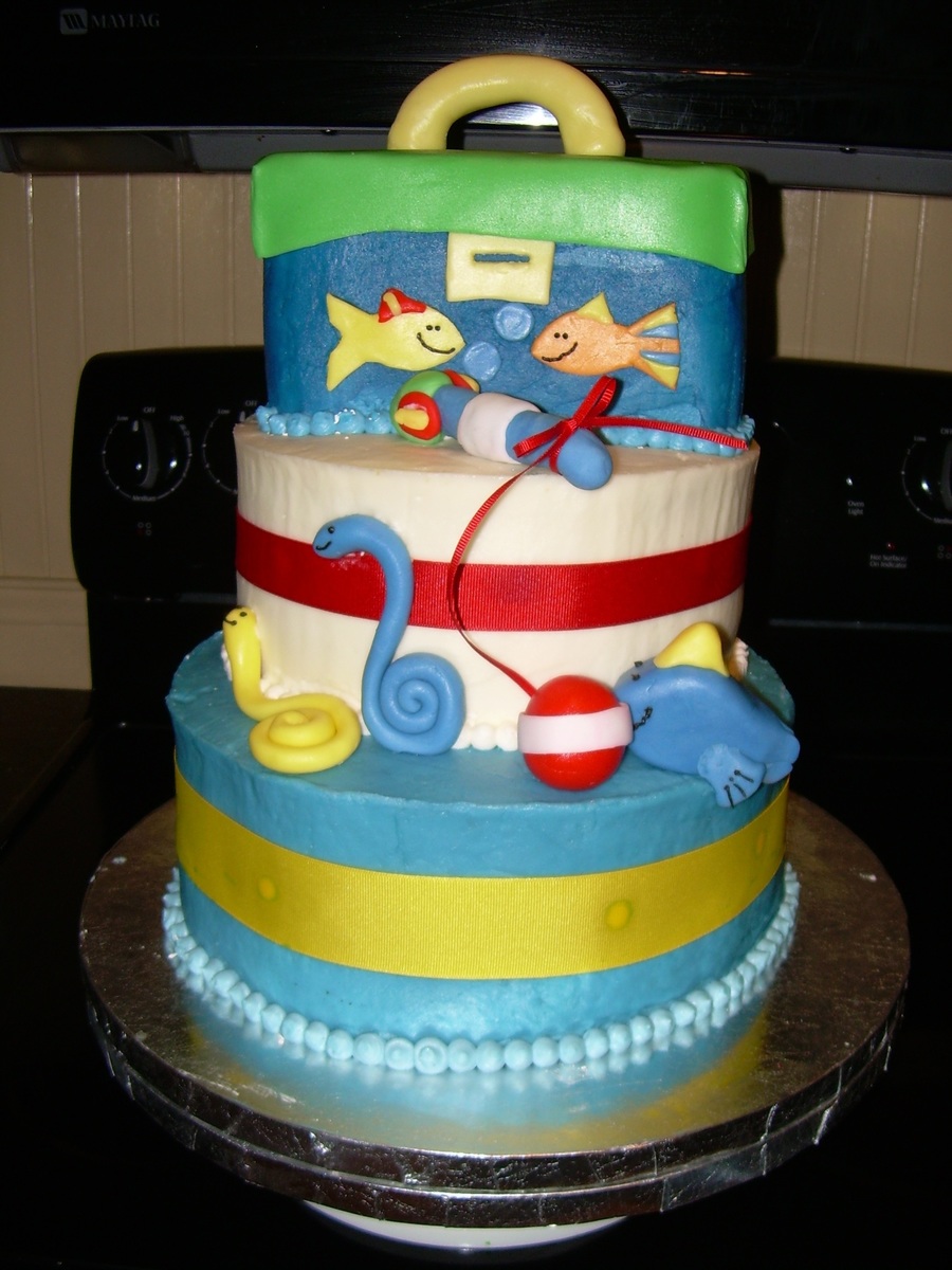 The client wanted me to replicate a fishing themed diaper cake, it was not easy, but so much fun! Top tier was a loaf pan then used fondant for the accents and handle.