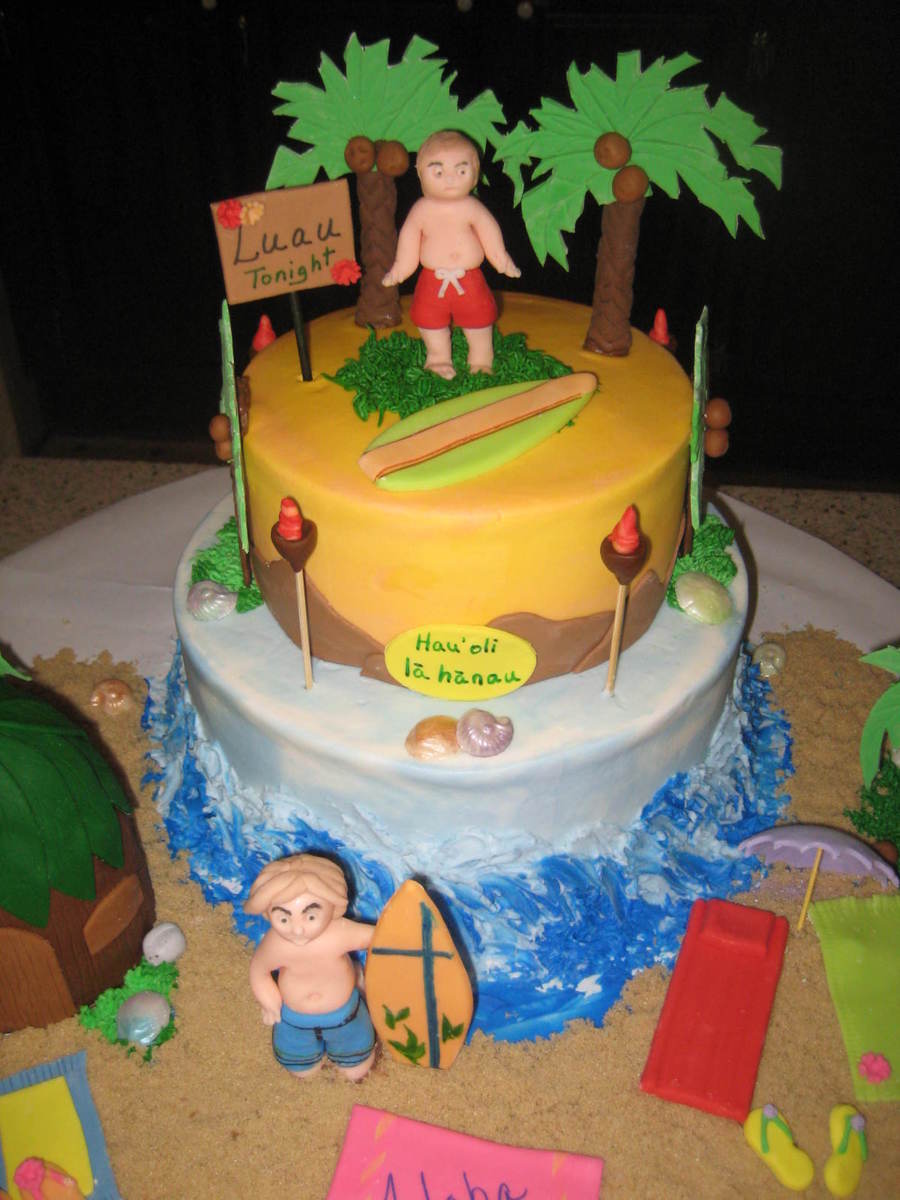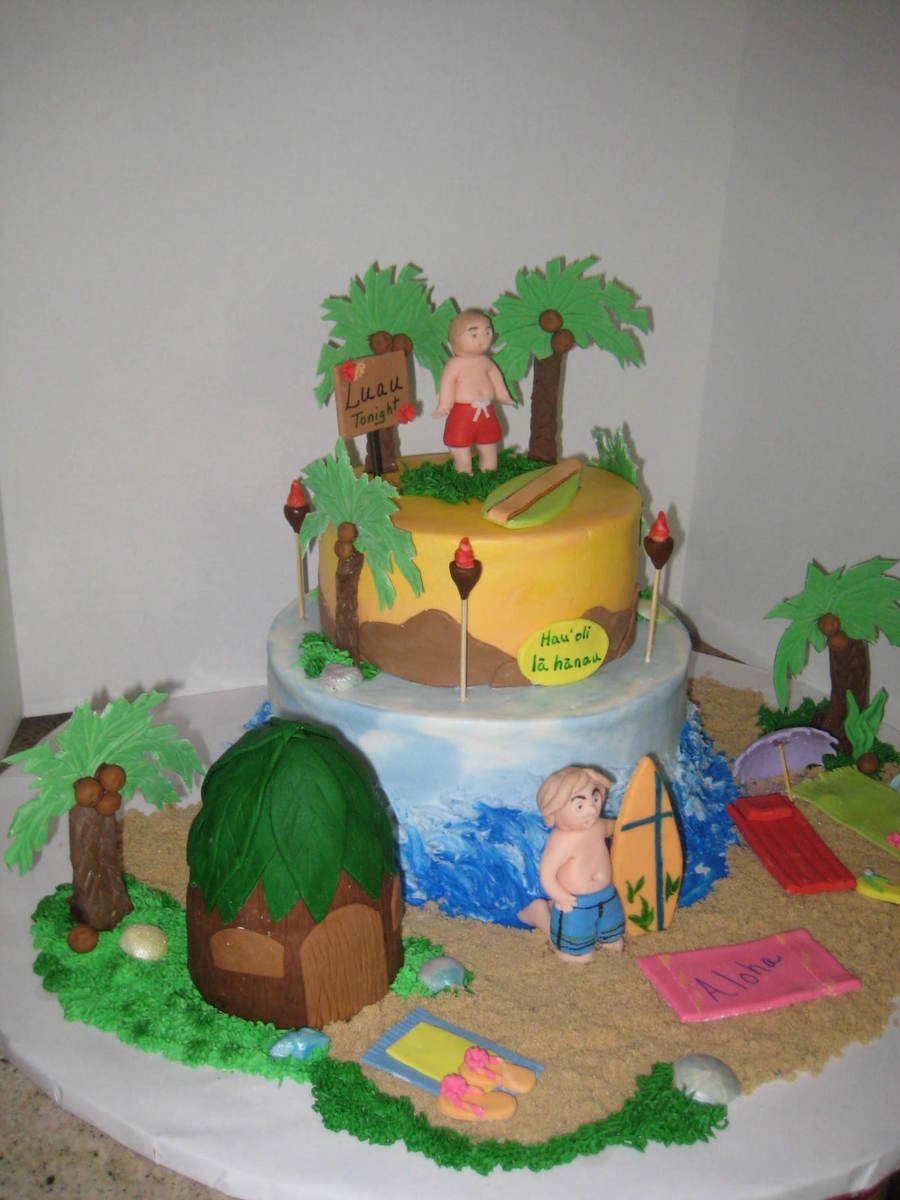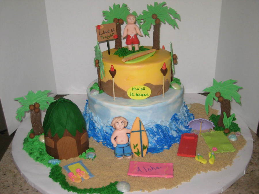 Thiscake was for 2 brothers, who wanted a Hawiian theme cake for their birthday, because they will be going there in a few days. Iced in buttercream, decorations are fondant, the hut is made from RC treats then cover in fondant, brown sugar was used for the sand & sea shells are made of candy melts, the rocks are candy rocks. TFL, God Bless, Sharon
