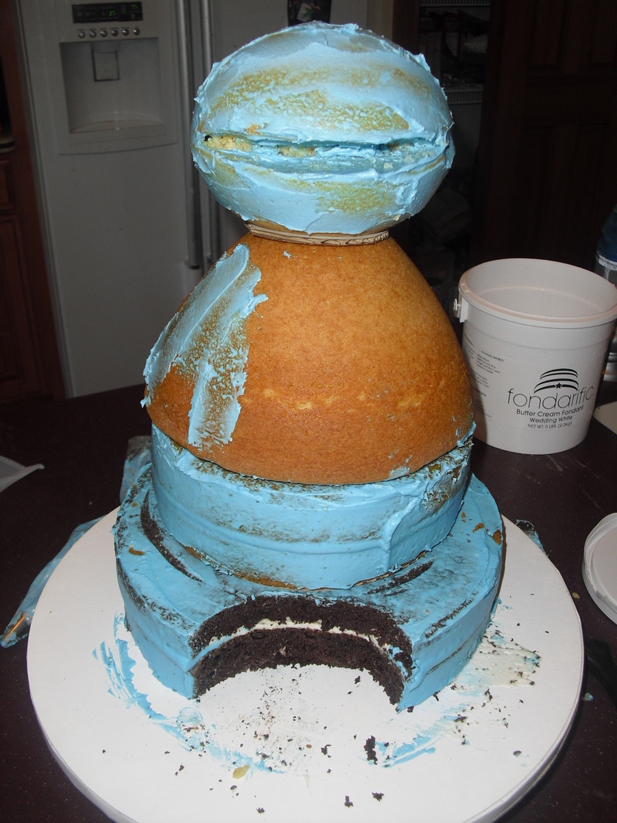 Made this for my son's first birthday... He's all cake. Special thanks to AmyCakes2 for her informative picture of her Cookie cake. 10" round, 2-8" rounds, wondermold, ball pan... I totally cheated and used store bought cookie dough for the cc cookies- TFL!