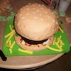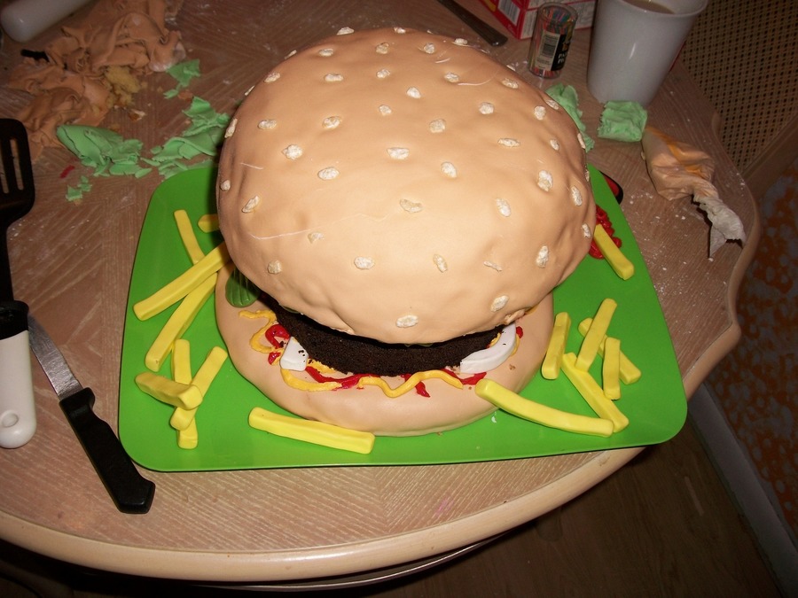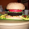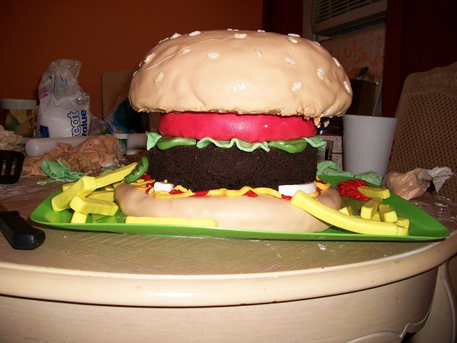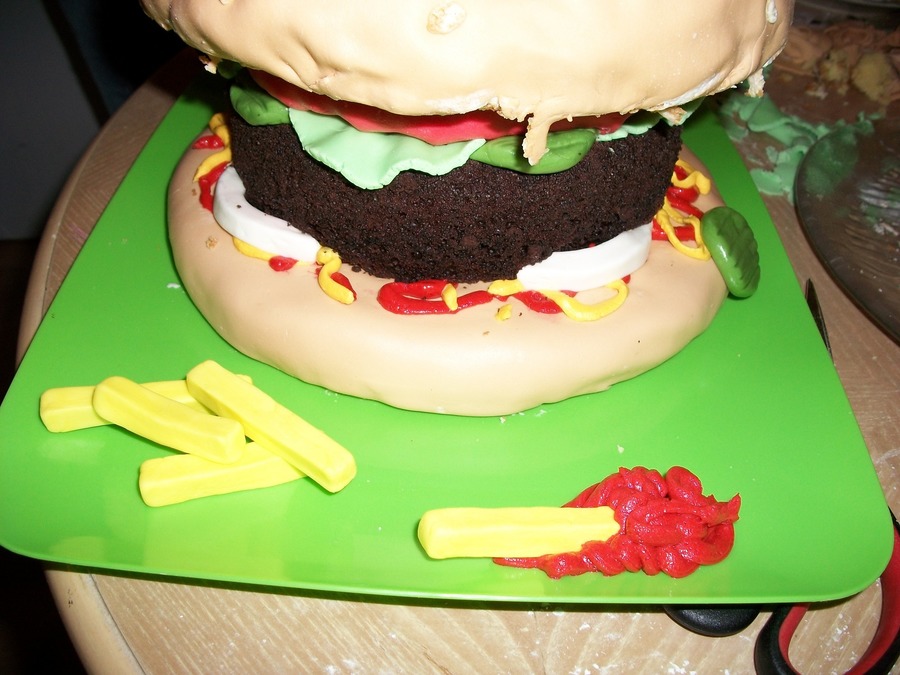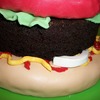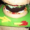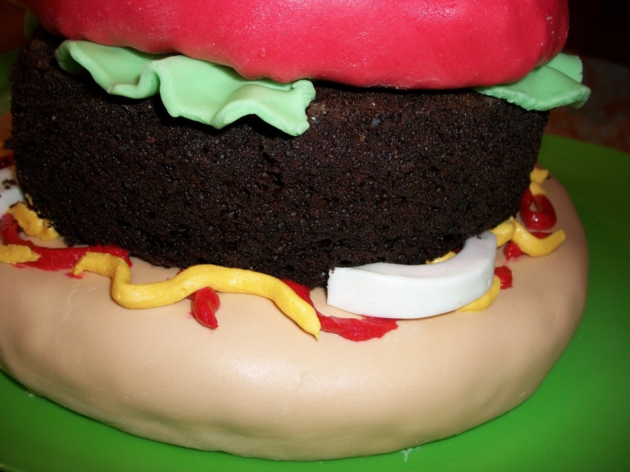 The bun is vanilla cake covered in marshmallow fondant and rice-crispy cereal "seeds". The burger itself is a "naked", trimmed chocolate cake to have the appearance of having a burger-like texture. The tomato is a layer of rice-crispy treat covered in marshmallow fondant. Condiments are colored butter cream icing. Marshmallow fondant for all the trimmings. The only thing I'd change if I did it again would be a smaller bun. However for a rush job, it's perfect. ( Much thanks to my helper, Jenny! )