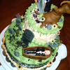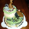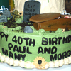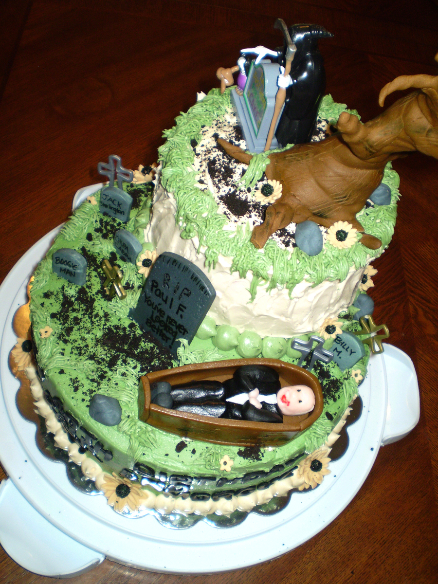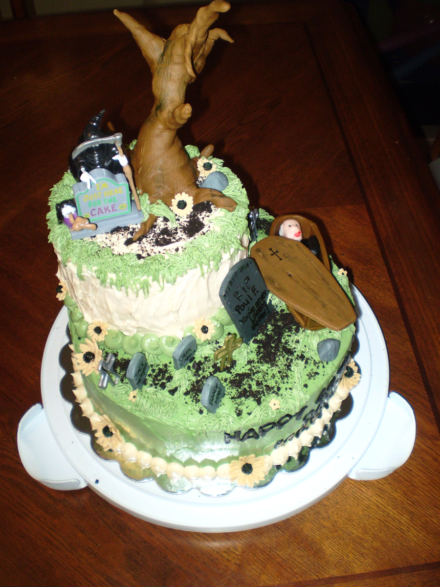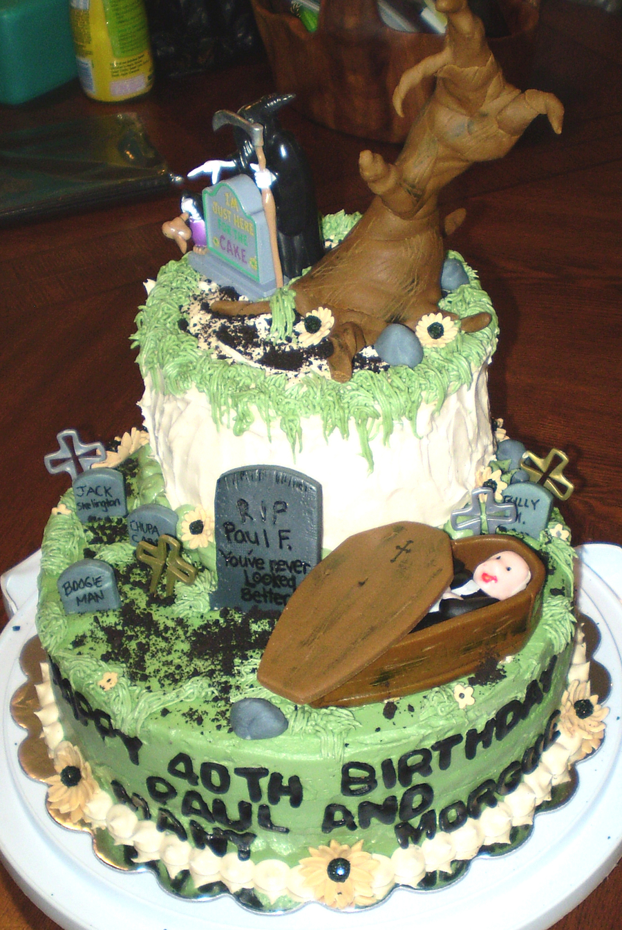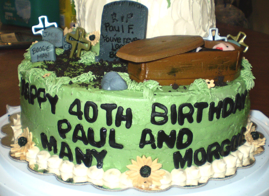 I made this cake for my friend's husband who's a mortician. She wanted a 'death' theme, so I came up with this and tried not to make it look too Halloweenish. The bottom reads, Happy 40th Birthday Paul And Many Morgue
