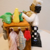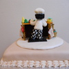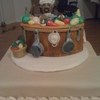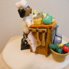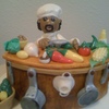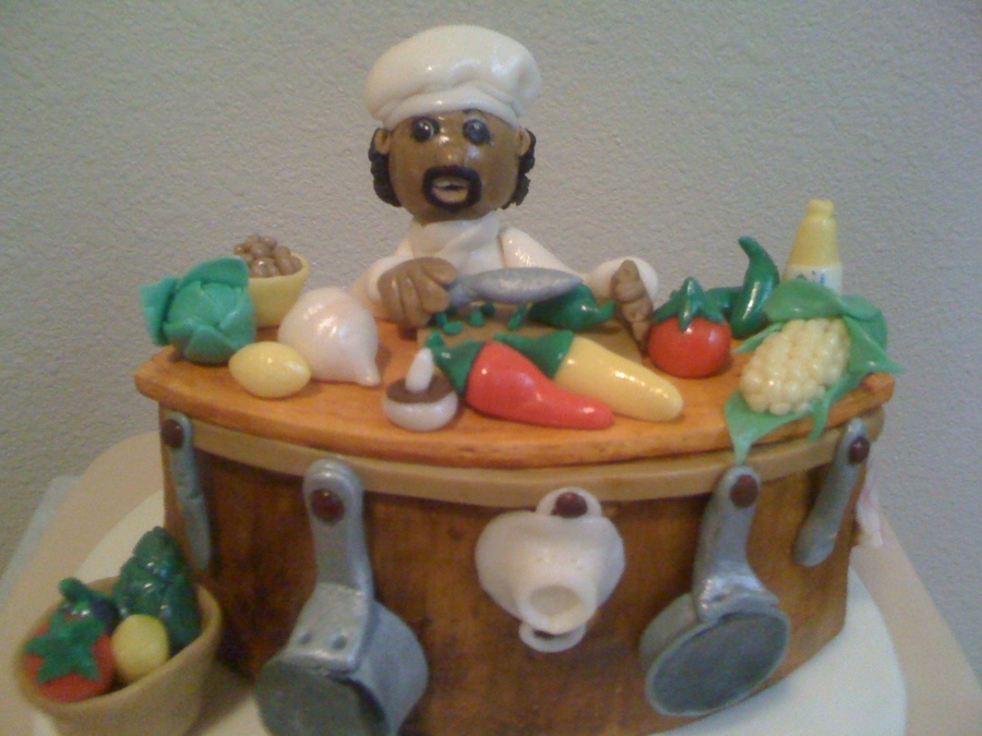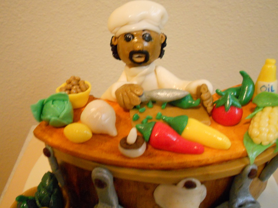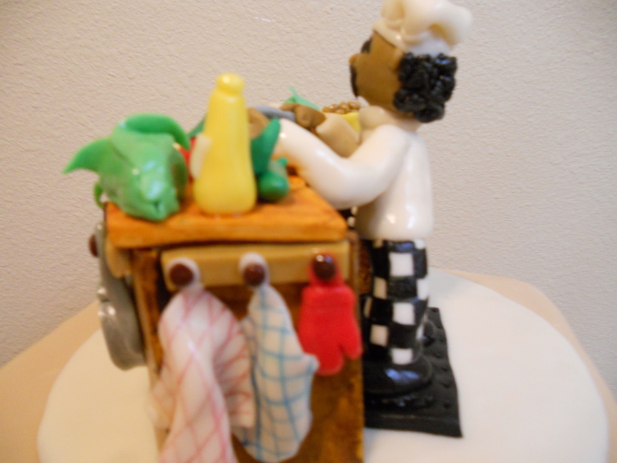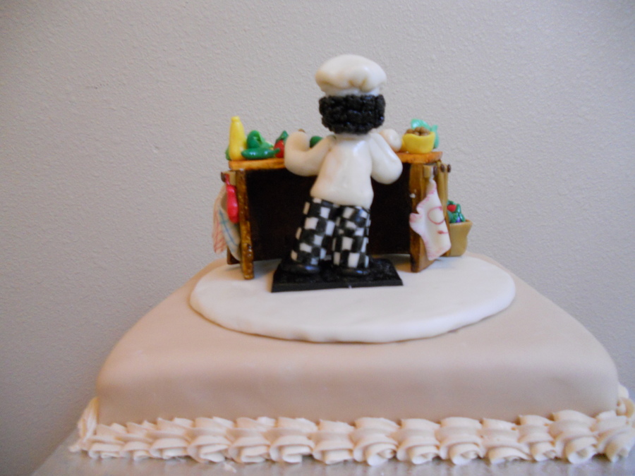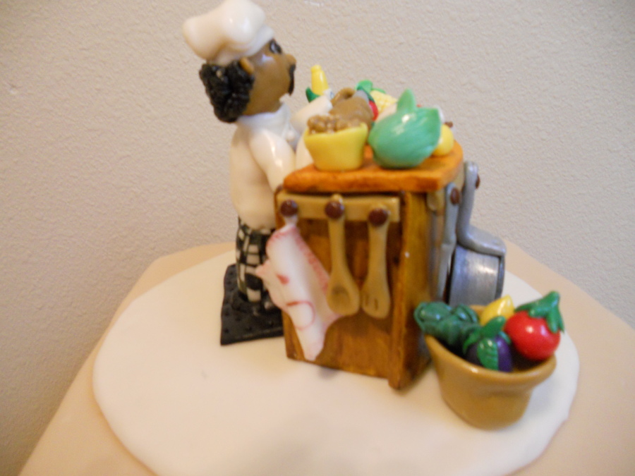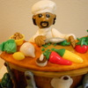 For my brothers birthday I decided to surprise him and make him a chef themed cake. 9" square chocolate cake with mocha buttercream and mocha fondant. Chefs counter is made from pastillage and painted with food coloring and vodka mixture. Everything else is molded from gumpaste and fondant.