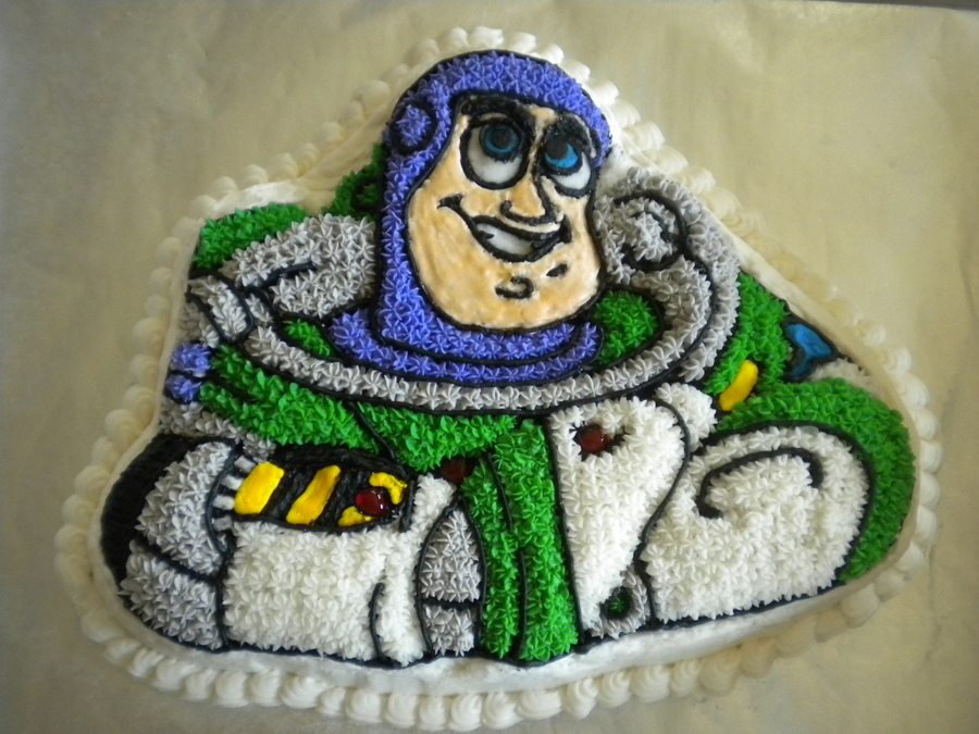 After doing Dora and Buzz this month, I can honestly say I am tired of character pans! I never imagined they were so much work- so many colors to mix and so many details to draw on your own. It's hard to see most of the details when the cakes first come out. Also, after all these years of seeing these pans at the store, it never occurred to me that the pic you see as an example is reverse of what you will actually make! Overall, I like the cake but I messed up and did not make the icing for his face dark enough. When I took a pic I realized it looked practically white. Later I tried brushing some newly tinted thinned icing over it. It would have been much better had I done it right the first time. Good thing I'd decided to do a smooth face so this attempt at recovery wasn't too hard. Thanks for looking.