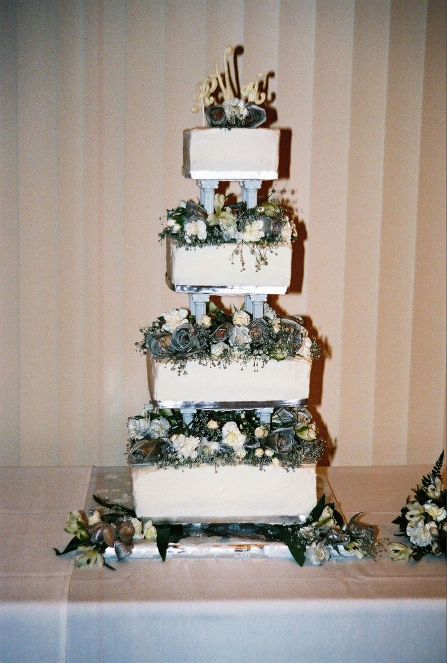 This is the largest and only the second wedding cake that I had ever made. It is buttercream frosting trimmed with silver ribbon and accented with silver and white flowers. The flowers were only supposed to be lightly sprayed with the silver, but there was a mix up with the florist. Instead of all white roses she ordered ivory with pink tips. Either way the cake tasted great. The cake was for my BIL wedding. They loved it. (Although I saw every flaw!)