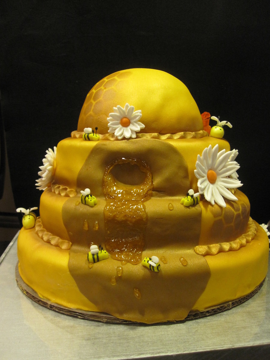 Beehive cake that I made for a friend. The cake is covered in a golden yellow fondant and I airbrushed the shading to give it a little depth. The bees are made out of gum paste and then I just drew the lines on the bee's with a edible black marker. I used piping gel and just tinted it a little brown/yellow for the honey and just piped it on. I thought that it turned out cute.