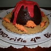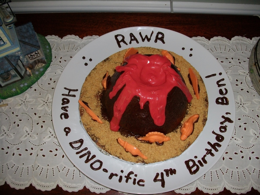 Cake baked in a PC Batter Bowl then covered while still warm with chocolate frosting. After cooling, cut a small crater in the top then poured on melted red chocolate. Added chocolate dinosaurs and graham cracker crumbels to the base.