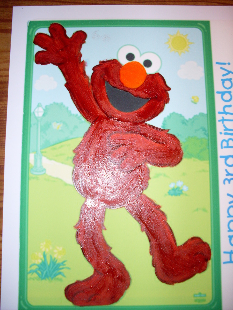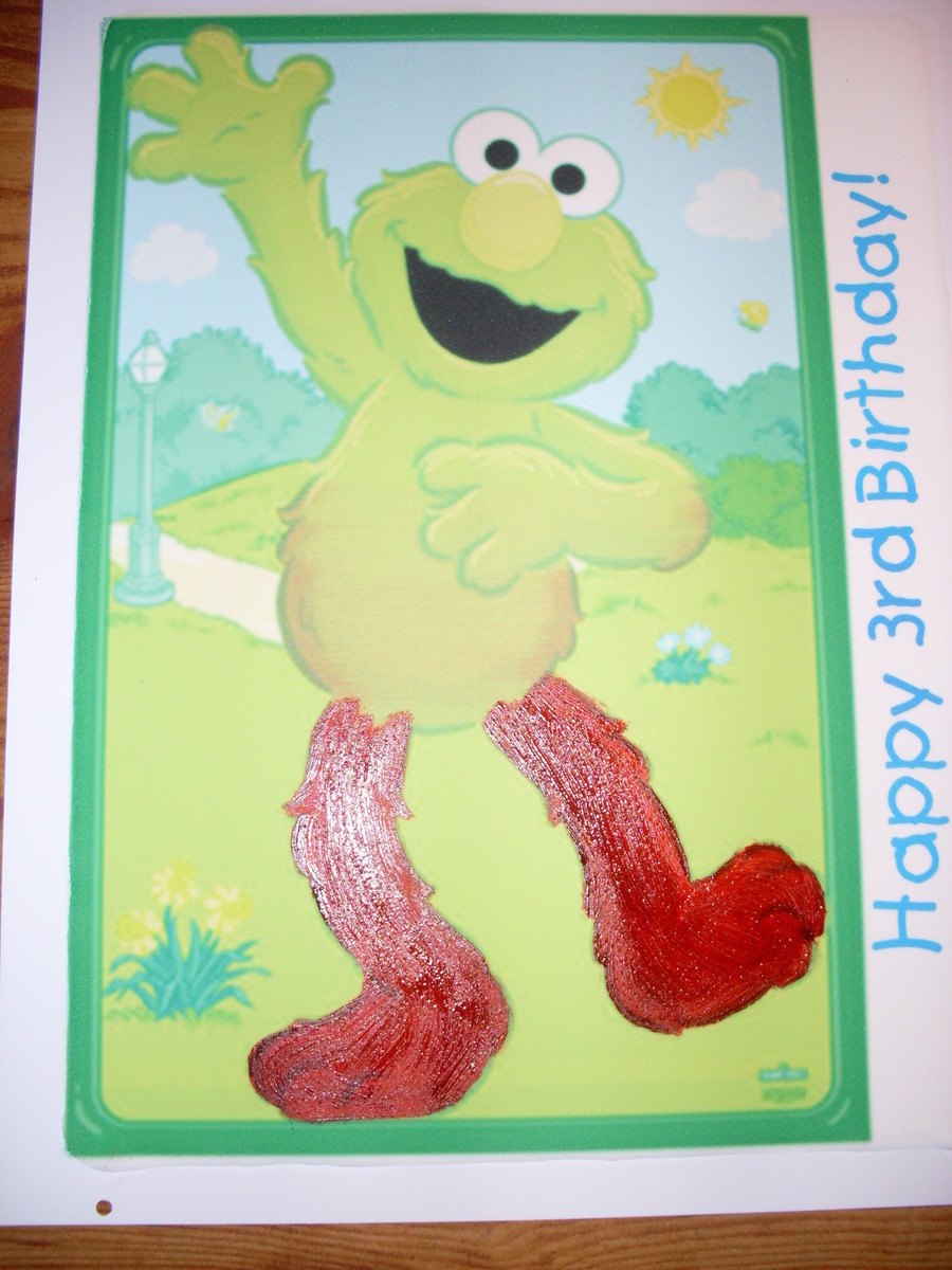 The top part of Elmo is how it come out of the edible image printer. The bottom half of Elmo is after I started "painting" his fur red with a food safe brush and Wilton icing gel. Second photo is the end result after I fixed his fur and nose. Still want to fix his eyes before I apply it to the cake this afternoon.