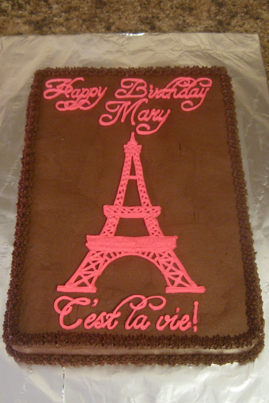 1/4 sheet cake. Chocolate buttercream frosting. Royal Icing words & tower.