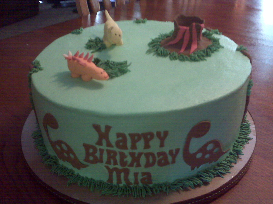 WASC chocolate cake. covered in white chocolate buttercream. the dino's and volcano and letters are gumpaste. the trees around the back are mmf. thanks for looking!