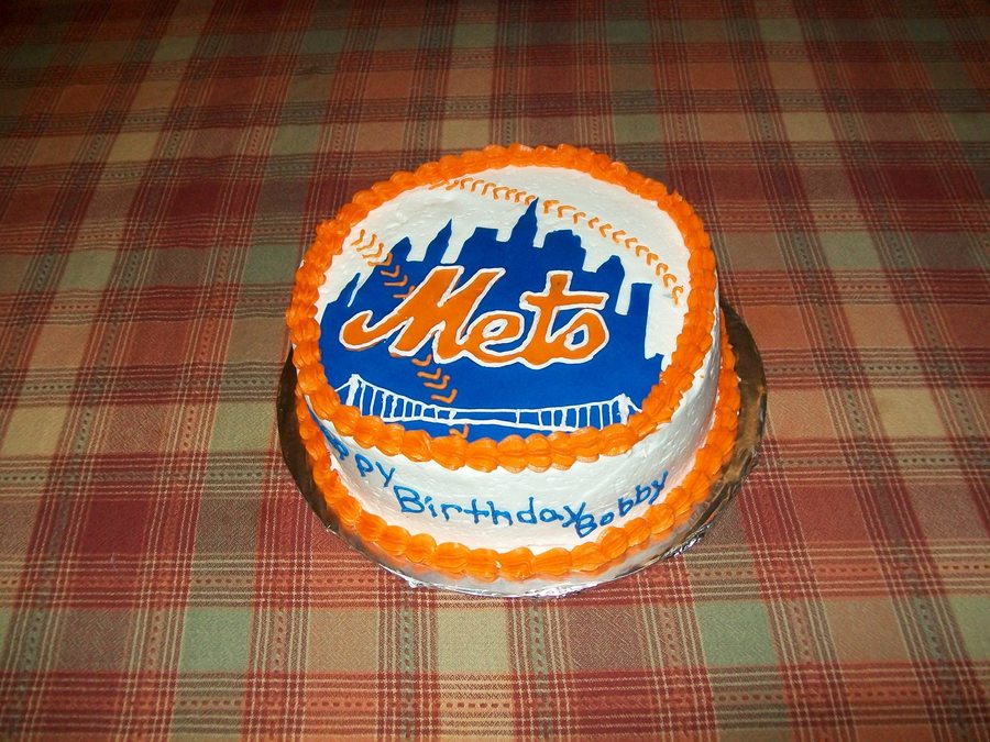 Cake I made for a friend's husband. Chocolate cake with Buttercream icing, Skyline and Mets logo are made out of fondant