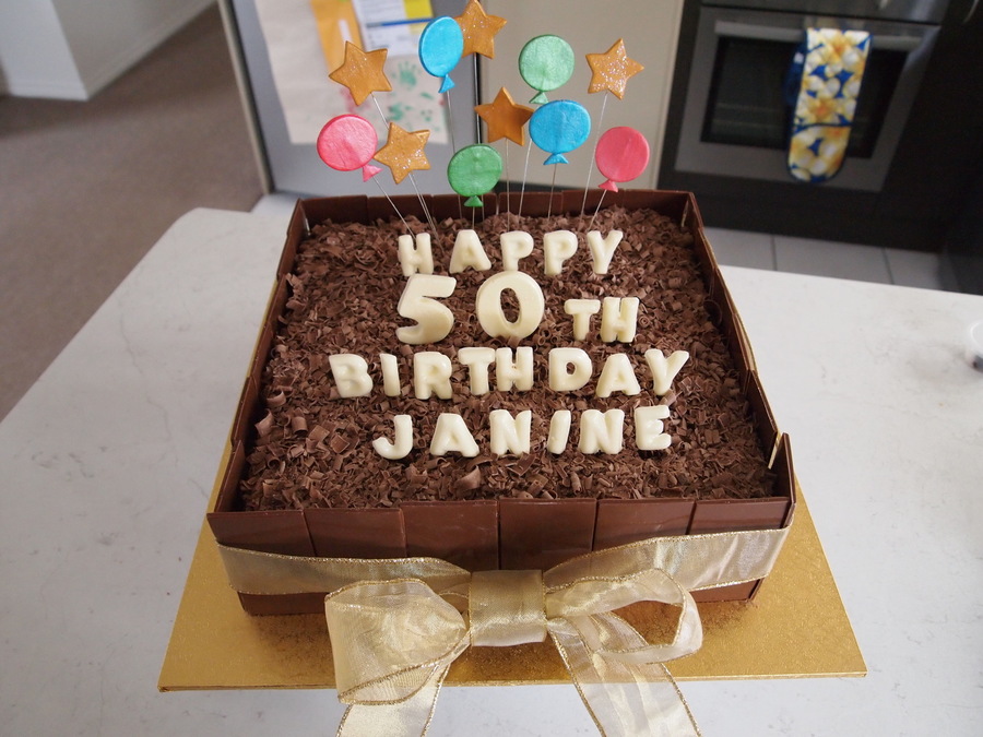 Chocolate mud cake covered in chocolate ganache and chocolate panels (made using a mould). Balloons and stars made from gumpaste. Wires are food safe and ends dipped in chocolate to prevent direct contact with cake. Letters are white chocolate.