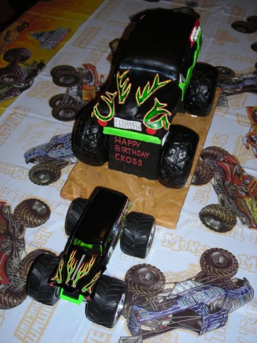 Thank you first of all to kathyw whose cake was my inspiration as well as the toy truck. Wooden frame based on the dimensions of the toy truck. Cake size was approx. 4X12 inches and 4 inches in height. Wooden fram covered in fondant. Choc. cake covered with Duff black fondant. Fondant details with painting and royal icing. Estimated time to make cake, 6 hours. Estimated time to eat cake 5 minutes.