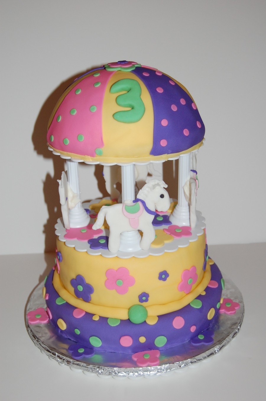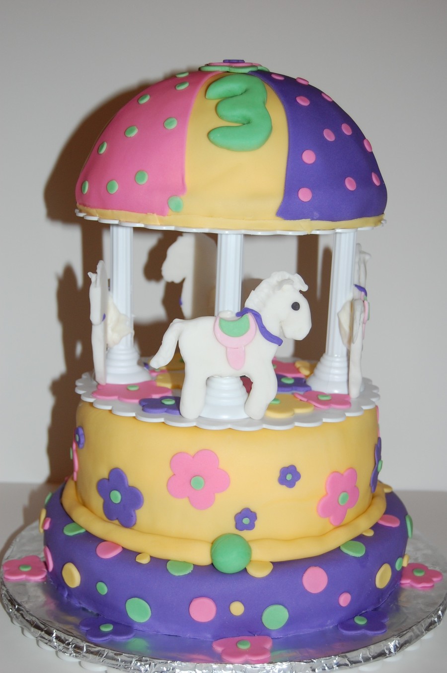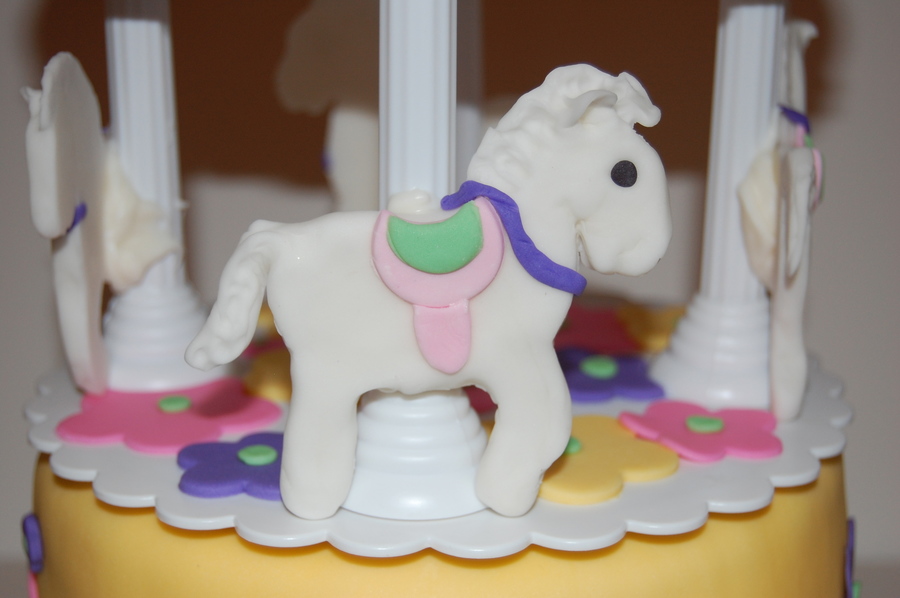 This was my first carousel cake!!! Cake is vanilla and filled with butter cream and covered with fondant. Each horse is slightly different b/c they were each hand sculptured from fondant. Horse are attached the the plastic post with white chocolate.