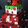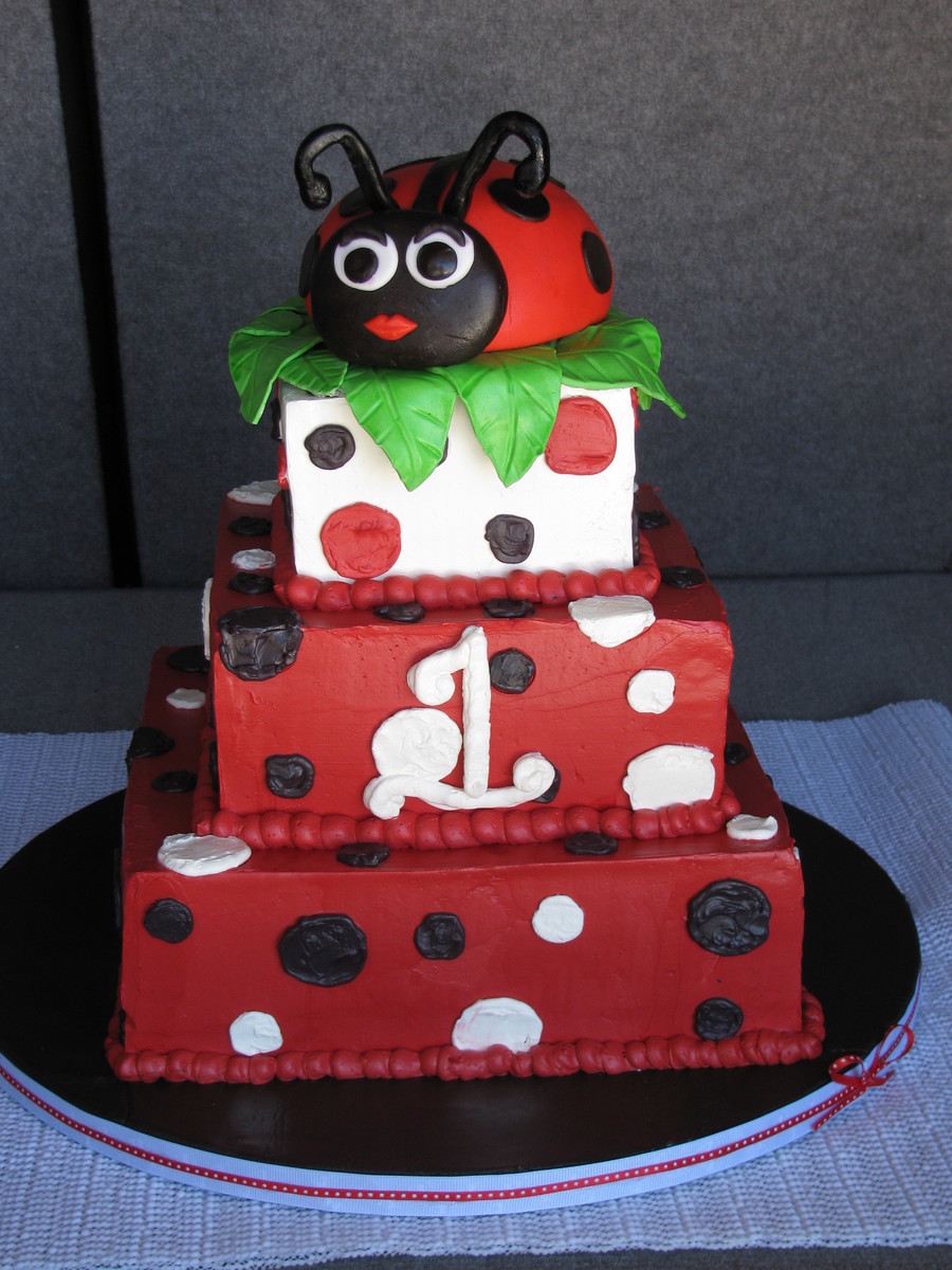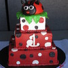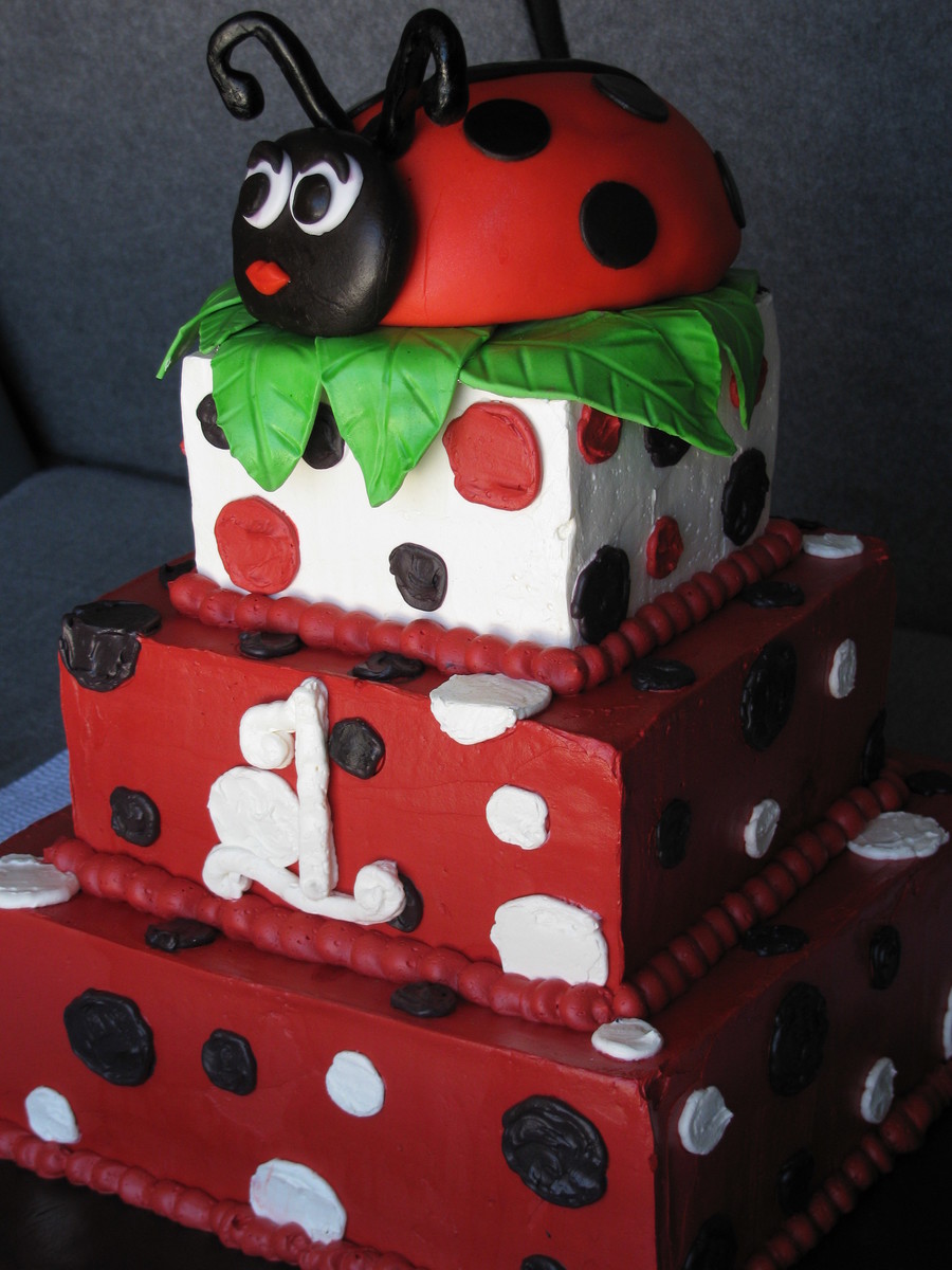 This is an attempt to replicate a ladybug cake I saw online (original by Pink Cake Box, I believe), except this is done in butter cream and not fondant. The ladybug is RKT covered in fondant.. Thanks for looking.