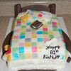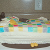 2 layers 9X13 french vanilla cake covered with BC and MMF. handpainted quilt squares. Headboard and posts are made of chocolate MMF and gumpaste mix. I borrowed the idea from a fellow cake central neighbor! Hers was way better, but I did not have the quilt cutters or detail cutters like she did. I did the best I could with what I had! The customer loved it.