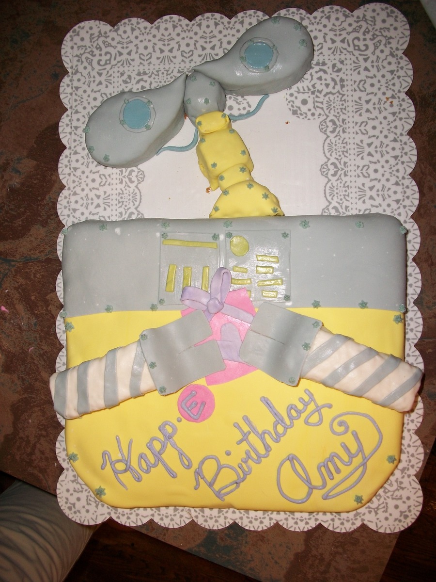A simple Wall E cake for one of my little cousins. Done with marshmallow fondant, buttercream for the writing and screws, and fondant covered rice crispy treats for the arms.
