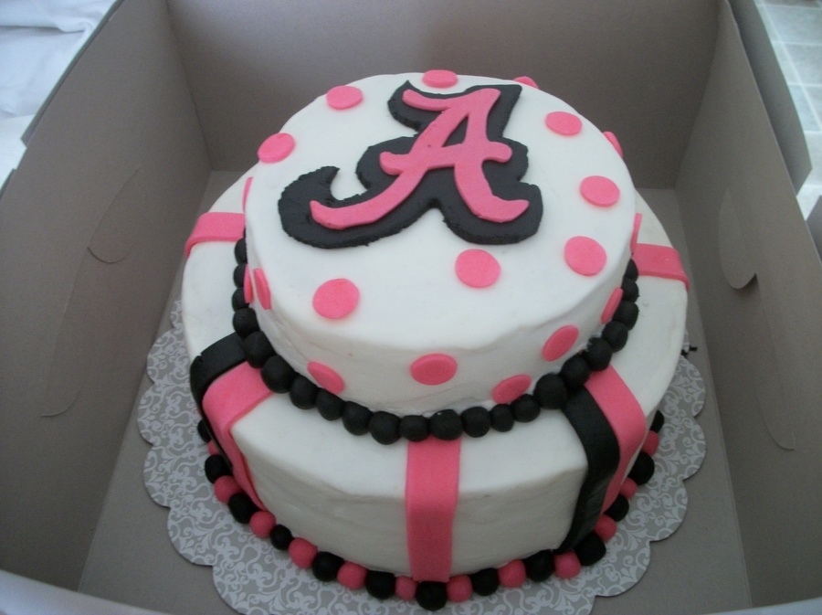 Alabama College pink , black , and white with polka dots and stripes butter cream with mm fondant decorations