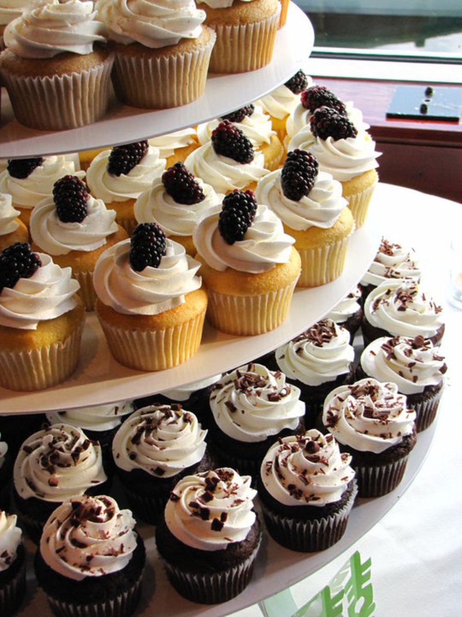 A trio of cupcakes for a friend's wedding. Chocolate fudge with ganache filling, chai with vanilla pastry cream filling and cardamon buttercream, french vanilla with huckleberry cream filling and buttercream frosting. There was a cutting cake on top with a Homer and Marge Simpson topper.